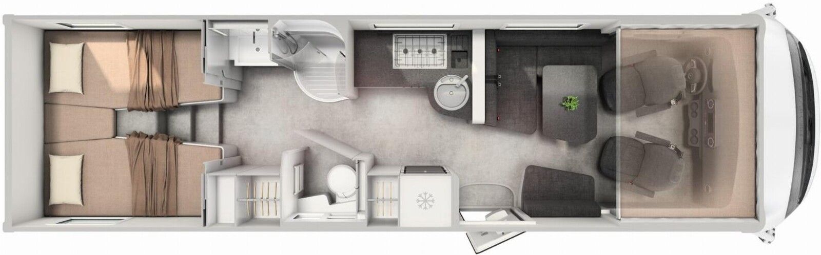 - Elektrischer Rollladen im Bug inkl. Sichtschutzrollo für Frontschreibe (von unten nach oben zuziehbar) und Sonnenblendenfunktion