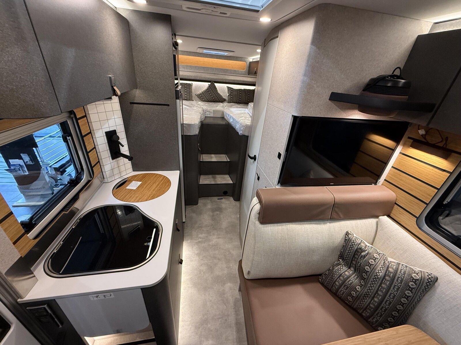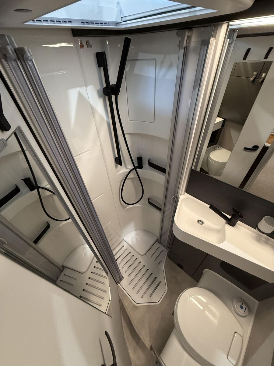 - Wohnkomfort-Paket (Schlafsystem mit Tellerfederrost für Heckbett(en), Spannbettlaken nach Maß für Heckbetten individuell an Matratzen angepasst, Filzverkleidung in Heckgarage, Einlegeboden in der Dusche für ebenen Laufboden, 4 Kissen mit Bezug, Ambient-Light-System: Mehr-Ebenen Lichtsystem mit dynamischer und individueller Steuerung der Beleuchtung (inkl. Lichttemperatur) sowie stimmungsvoller Sockelbeleuchtung, Lichtpaket (Multifunktionale Pendelleuchte sowie eine Ambiente-Leseleuchte für die Multifunktionswände), 3 x 230 V / 1 x 12 V Zusatzsteckdosen)